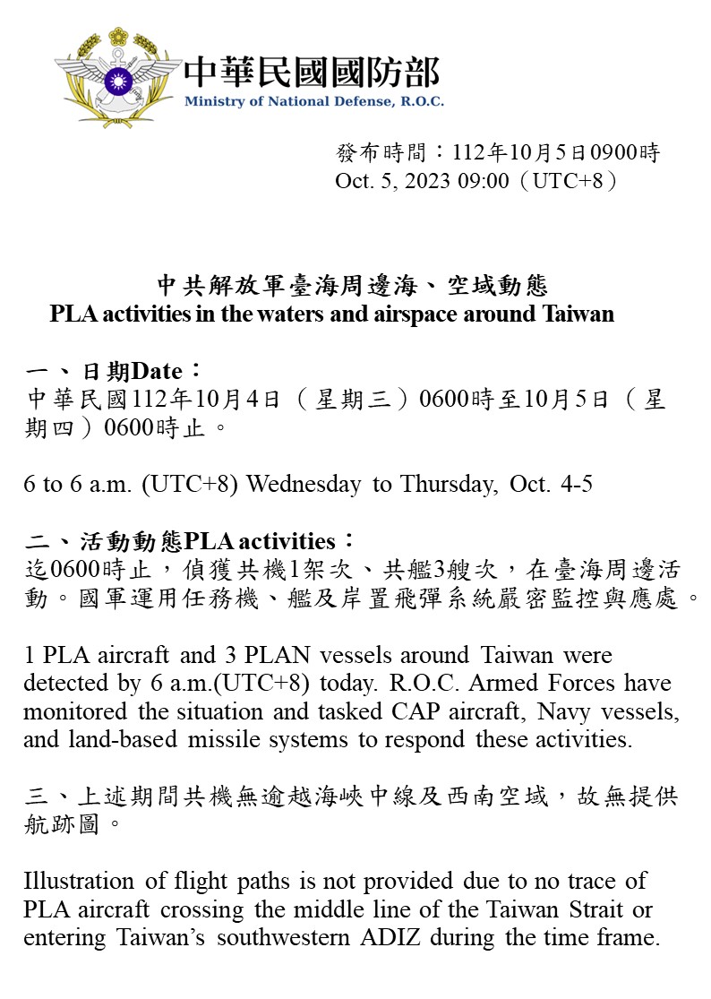 迄0600時止,偵獲共機1架次、共艦3艘次,在臺海周邊活動。國軍運用任務機、艦及岸置飛彈系統嚴密監控與應處。