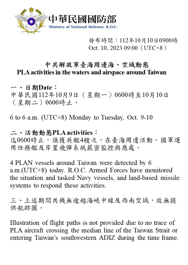 迄0600時止,偵獲共艦4艘次,在臺海周邊活動。國軍運用任務艦及岸置飛彈系統嚴密監控與應處。