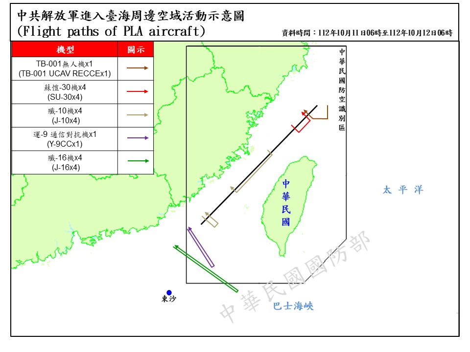 迄0600時止,偵獲共機20架次(其中逾越海峽中線及其延伸線進入西南及北部空域14架次)、共艦6艘次,在臺海周邊活動。國軍運用任務機、艦及岸置飛彈系統嚴密監控與應處。