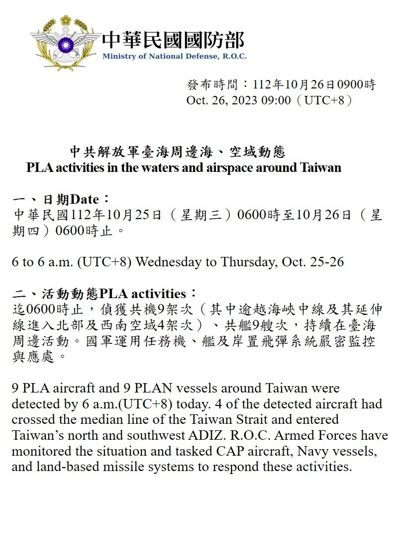迄0600時止,偵獲共機9架次(其中逾越海峽中線及其延伸線進入北部及西南空域4架次)、共艦9艘次,持續在臺海周邊活動。國軍運用任務機、艦及岸置飛彈系統嚴密監控與應處。