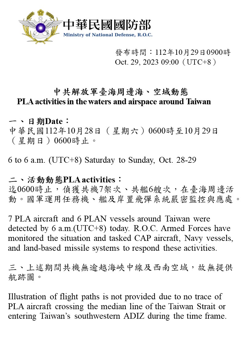 迄0600時止,偵獲共機7架次、共艦6艘次,在臺海周邊活動。國軍運用任務機、艦及岸置飛彈系統嚴密監控與應處。