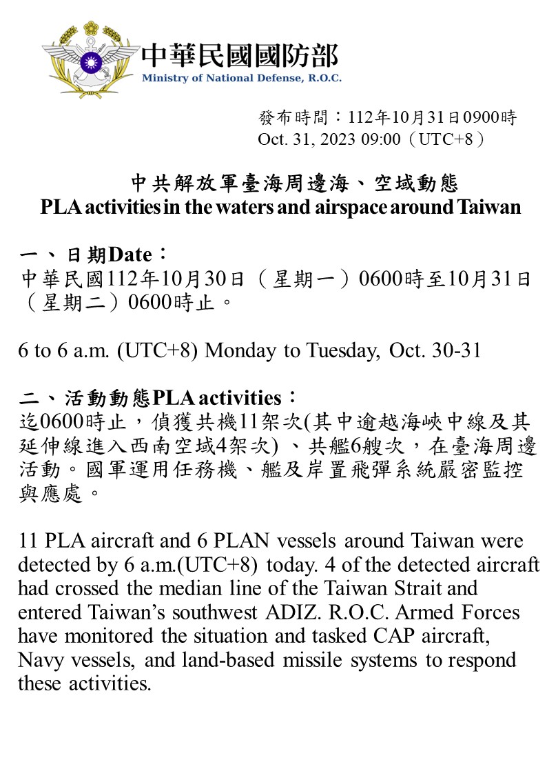 迄0600時止,偵獲共機11架次(其中逾越海峽中線及其延伸線進入西南空域4架次) 、共艦6艘次,在臺海周邊活動。國軍運用任務機、艦及岸置飛彈系統嚴密監控與應處。