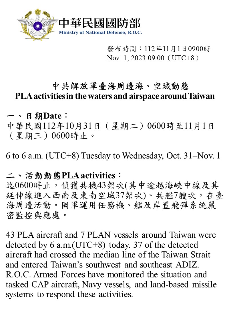 迄0600時止,偵獲共機43架次(其中逾越海峽中線及其延伸線進入西南及東南空域37架次)、共艦7艘次,在臺海周邊活動。國軍運用任務機、艦及岸置飛彈系統嚴密監控與應處。