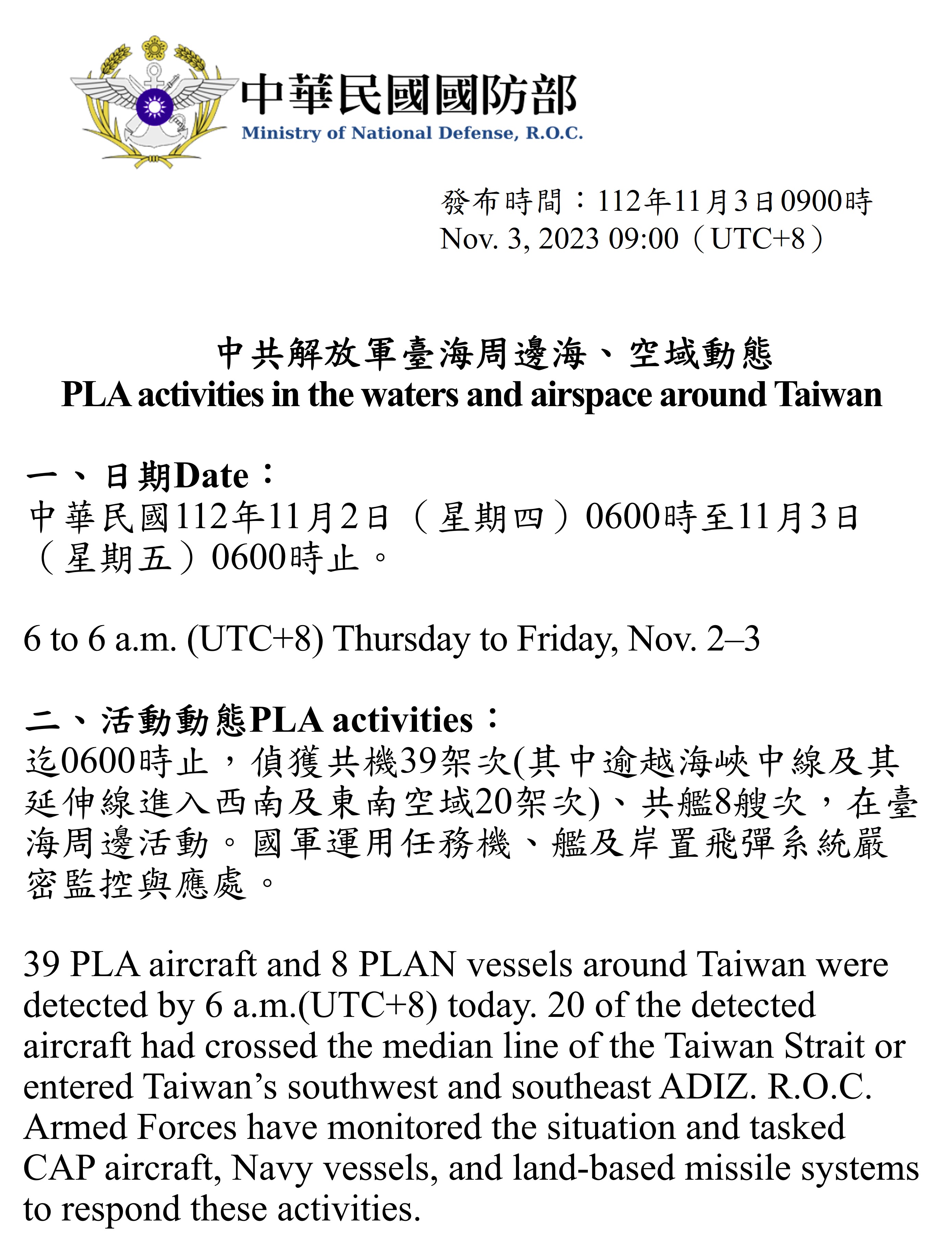 迄0600時止,偵獲共機39架次(其中逾越海峽中線及其延伸線進入西南及東南空域20架次)、共艦8艘次,在臺海周邊活動。國軍運用任務機、艦及岸置飛彈系統嚴密監控與應處。