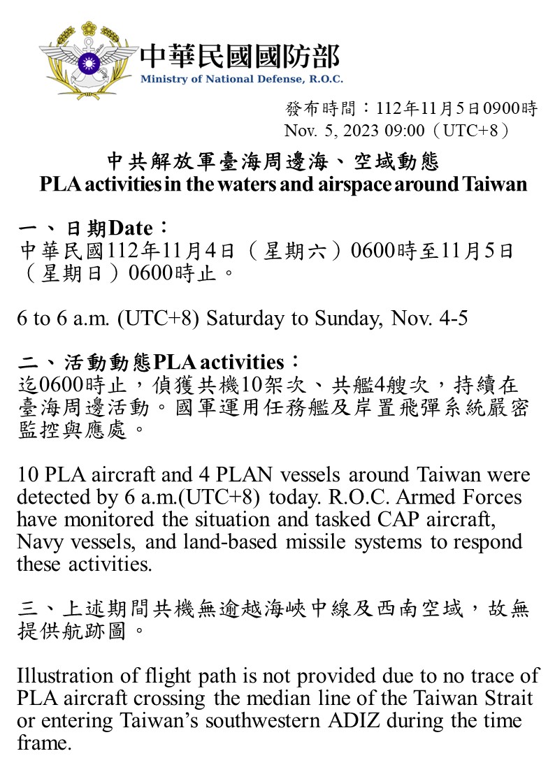 迄0600時止,偵獲共機10架次、共艦4艘次,持續在臺海周邊活動。國軍運用任務機、艦及岸置飛彈系統嚴密監控與應處。