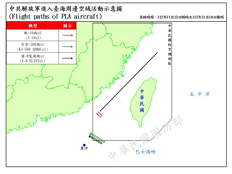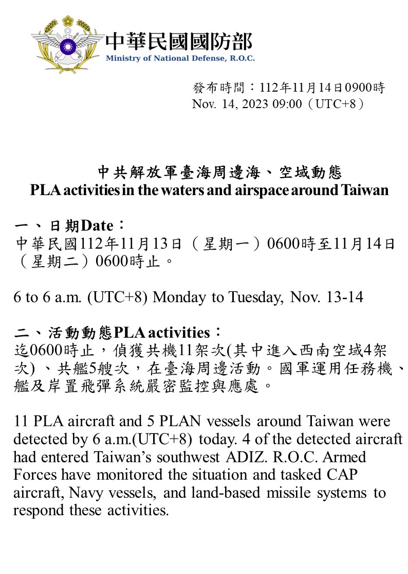 迄0600時止,偵獲共機11架次(其中進入西南空域4架次) 、共艦5艘次,在臺海周邊活動。國軍運用任務機、艦及岸置飛彈系統嚴密監控與應處。