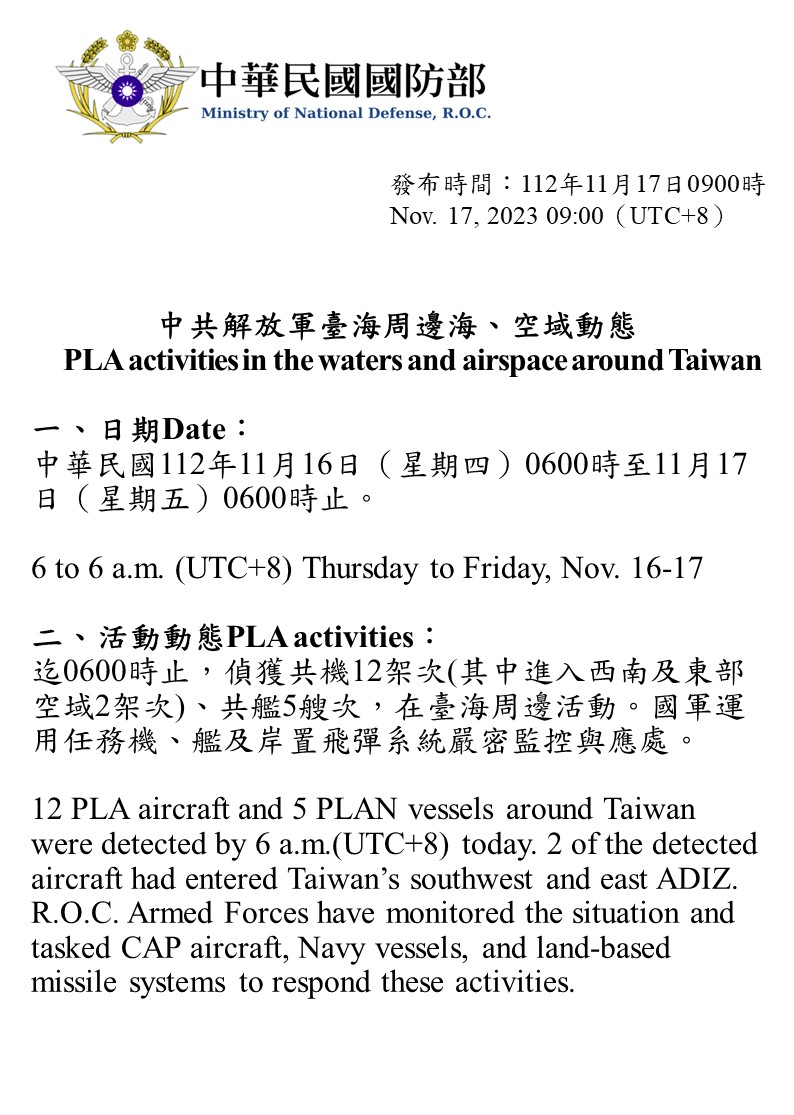 迄0600時止,偵獲共機12架次(其中進入西南及東部空域2架次)、共艦5艘次,在臺海周邊活動。國軍運用任務機、艦及岸置飛彈系統嚴密監控與應處。