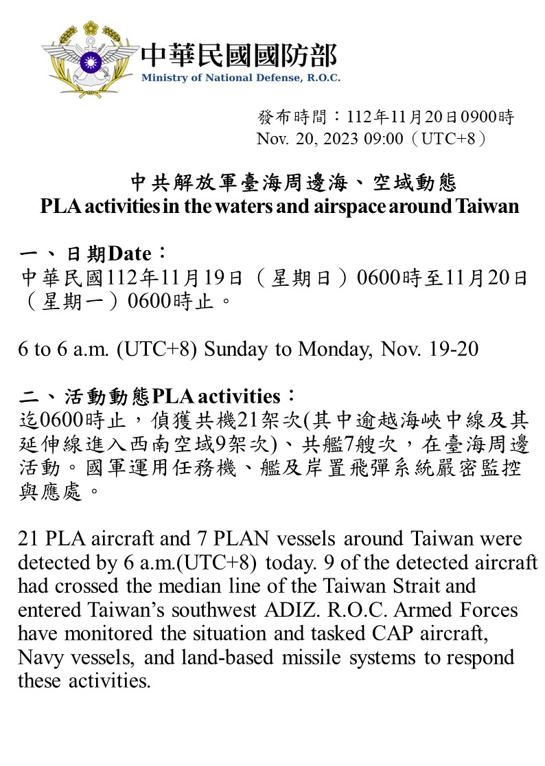 迄0600時止,偵獲共機21架次(其中逾越海峽中線及其延伸線進入西南空域9架次)、共艦7艘次,在臺海周邊活動。國軍運用任務機、艦及岸置飛彈系統嚴密監控與應處。