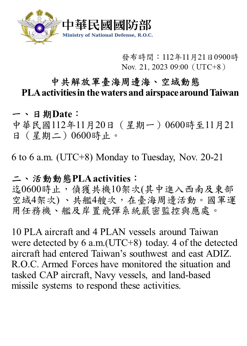 迄0600時止,偵獲共機10架次(其中進入西南及東部空域4架次)、共艦4艘次,在臺海周邊活動。國軍運用任務機、艦及岸置飛彈系統嚴密監控與應處。