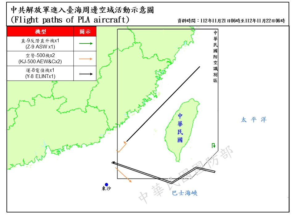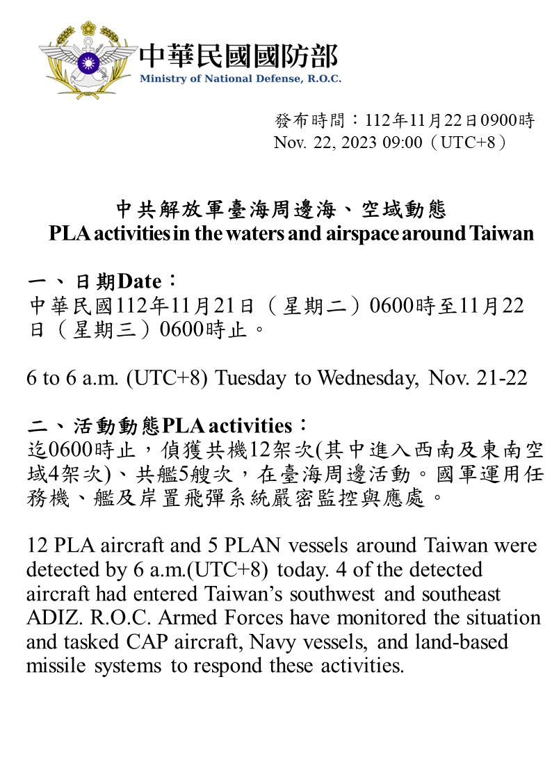 迄0600時止,偵獲共機12架次(其中進入西南及東南空域4架次)、共艦5艘次,在臺海周邊活動。國軍運用任務機、艦及岸置飛彈系統嚴密監控與應處。