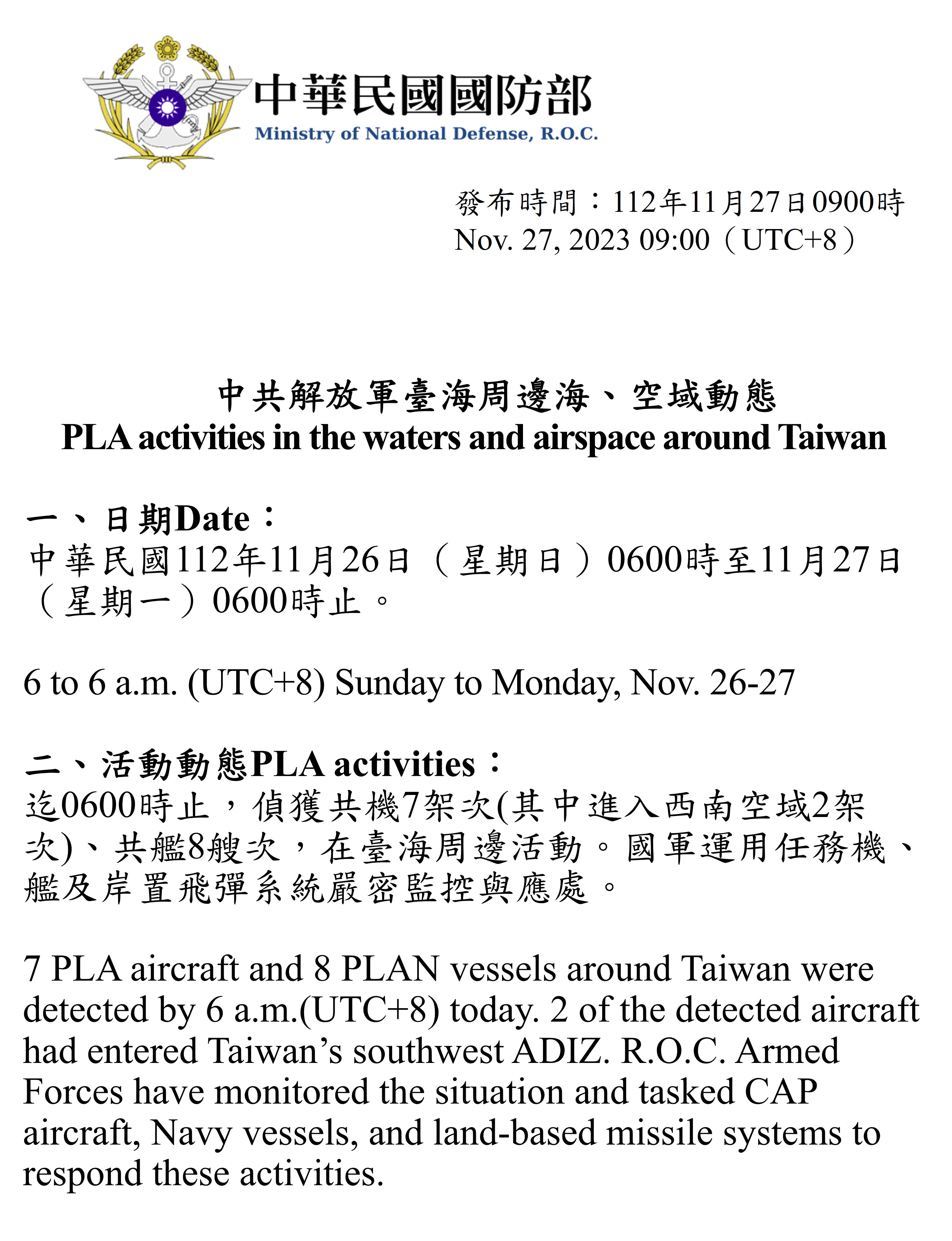 迄0600時止,偵獲共機7架次(其中進入西南空域2架次)、共艦8艘次,在臺海周邊活動。國軍運用任務機、艦及岸置飛彈系統嚴密監控與應處。