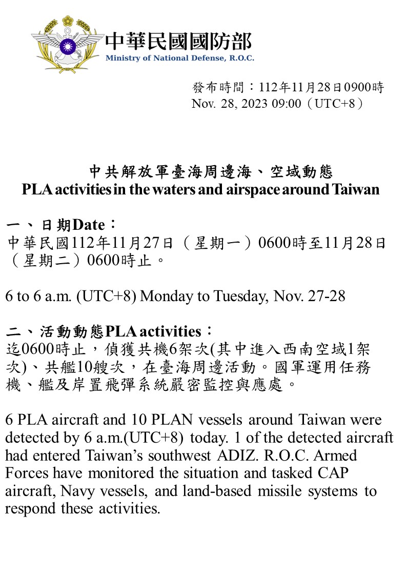 迄0600時止,偵獲共機6架次(其中進入西南空域1架次)、共艦10艘次,在臺海周邊活動。國軍運用任務機、艦及岸置飛彈系統嚴密監控與應處。
