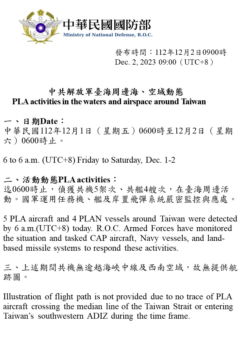 迄0600時止,偵獲共機5架次、共艦4艘次,在臺海周邊活動。國軍運用任務機、艦及岸置飛彈系統嚴密監控與應處。