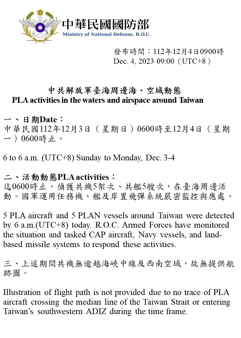 迄0600時止,偵獲共機5架次、共艦5艘次,在臺海周邊活動。國軍運用任務機、艦及岸置飛彈系統嚴密監控與應處。