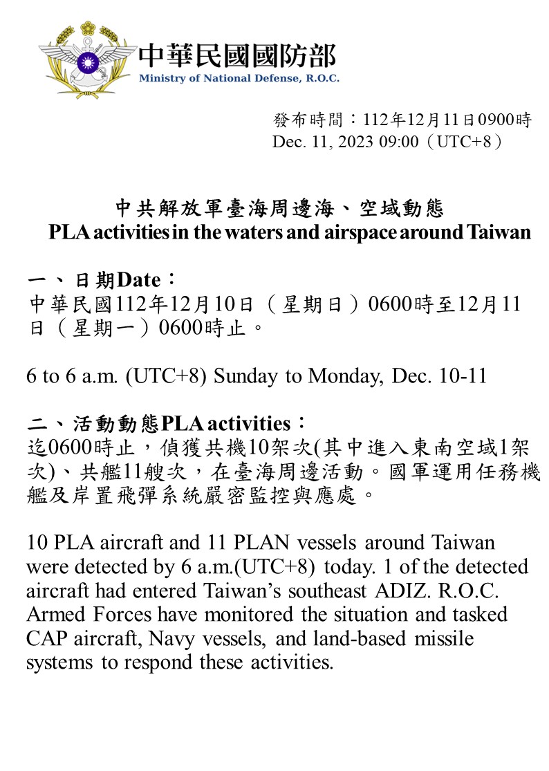 迄0600時止,偵獲共機10架次(其中進入東南空域1架次)、共艦11艘次,在臺海周邊活動。國軍運用任務機、艦及岸置飛彈系統嚴密監控與應處。