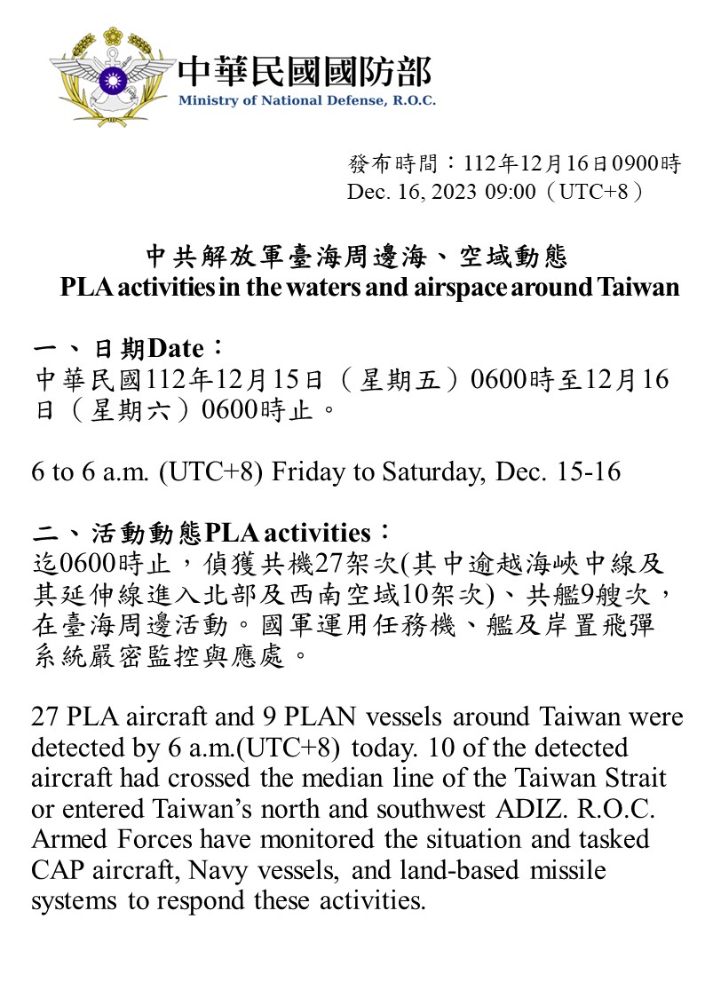 迄0600時止,偵獲共機27架次(其中逾越海峽中線及其延伸線進入北部及西南空域10架次)、共艦9艘次,持續在臺海周邊活動。國軍運用任務機、艦及岸置飛彈系統嚴密監控與應處。
