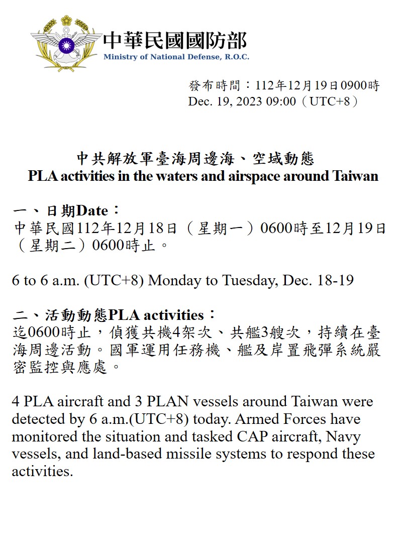 迄0600時止,偵獲共機4架次、共艦3艘次,持續在臺海周邊活動。國軍運用任務機、艦及岸置飛彈系統嚴密監控與應處。