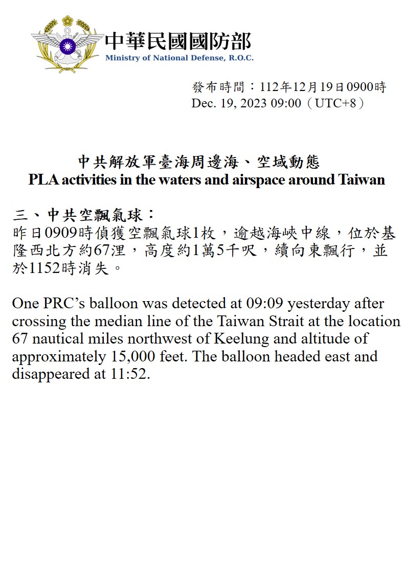 昨日0909時偵獲空飄氣球1枚,逾越海峽中線,位於基隆西北方約67浬,高度約1萬5千呎,續向東飄行,並於1152時消失。