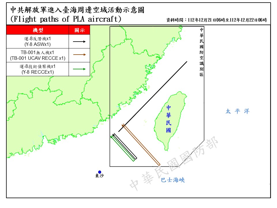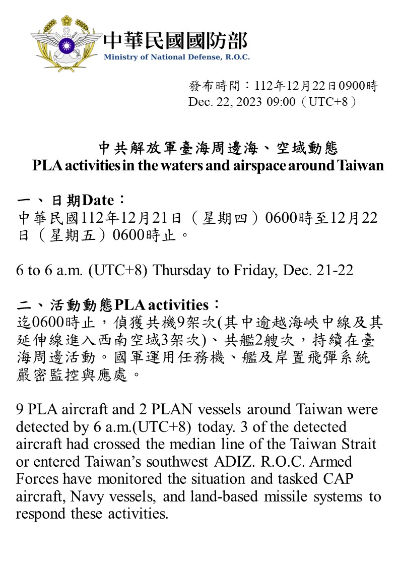 迄0600時止,偵獲共機9架次(其中逾越海峽中線及其延伸線進入西南空域3架次)、共艦2艘次,持續在臺海周邊活動。國軍運用任務機、艦及岸置飛彈系統嚴密監控與應處。
