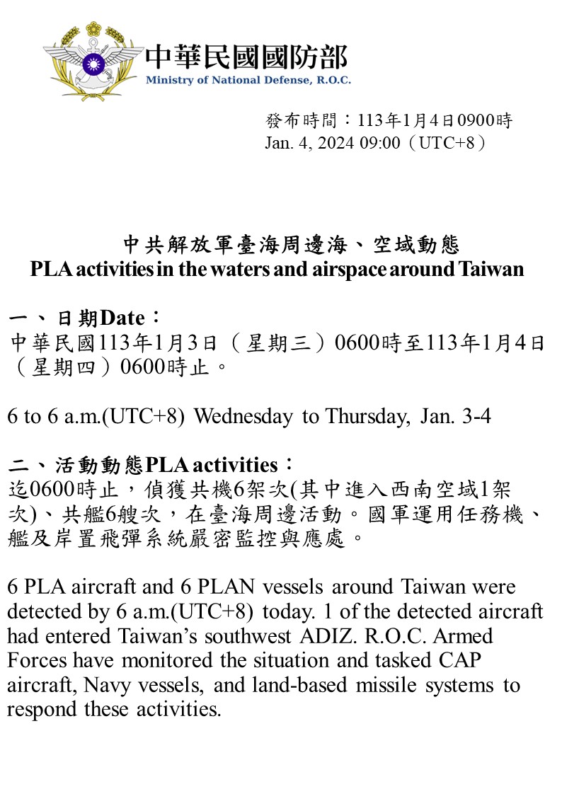 迄0600時止,偵獲共機6架次(其中進入西南空域1架次)、共艦6艘次,持續在臺海周邊活動。國軍運用任務機、艦及岸置飛彈系統嚴密監控與應處。