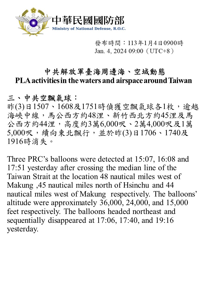 昨(3)日1507、1608及1751時偵獲空飄氣球各1枚,逾越海峽中線,馬公西方約48浬、新竹西北方約45浬及馬公西方約44浬,高度約3萬6,000呎、2萬4,000呎及1萬5,000呎,續向東北飄行,並於昨(3)日1706、1740及1916時消失。