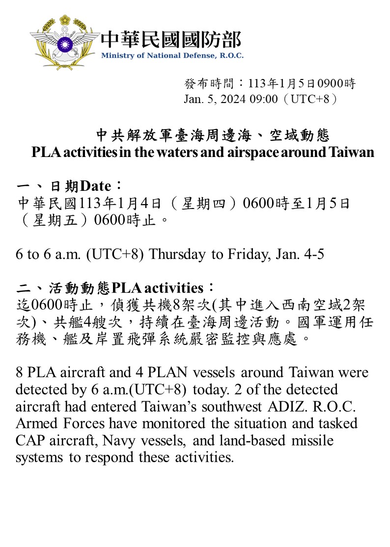迄0600時止,偵獲共機8架次(其中進入西南空域2架次)、共艦4艘次,持續在臺海周邊活動。國軍運用任務機、艦及岸置飛彈系統嚴密監控與應處。