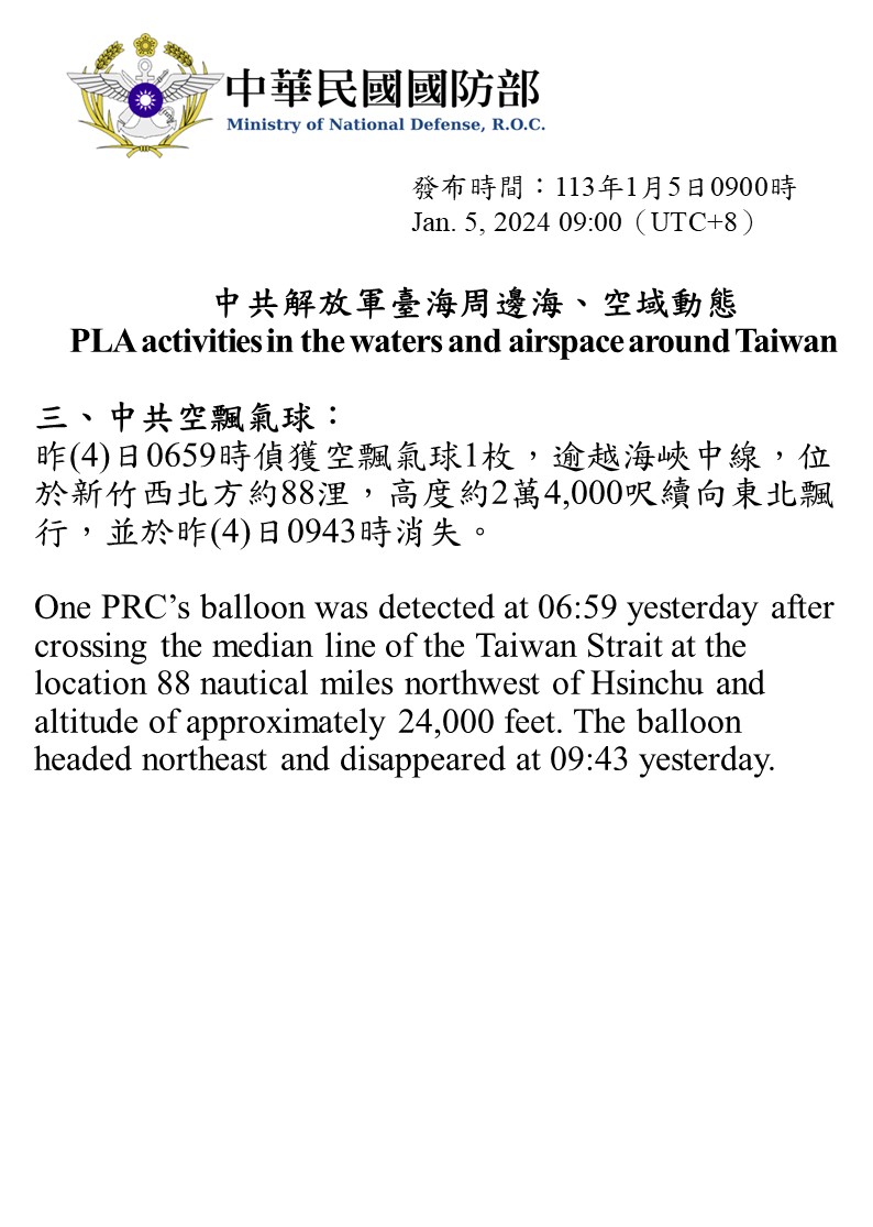 昨(4)日0659時偵獲空飄氣球1枚,逾越海峽中線,位於新竹西北方約88浬,高度約2萬4,000呎續向東北飄行,並於昨(4)日0943時消失。