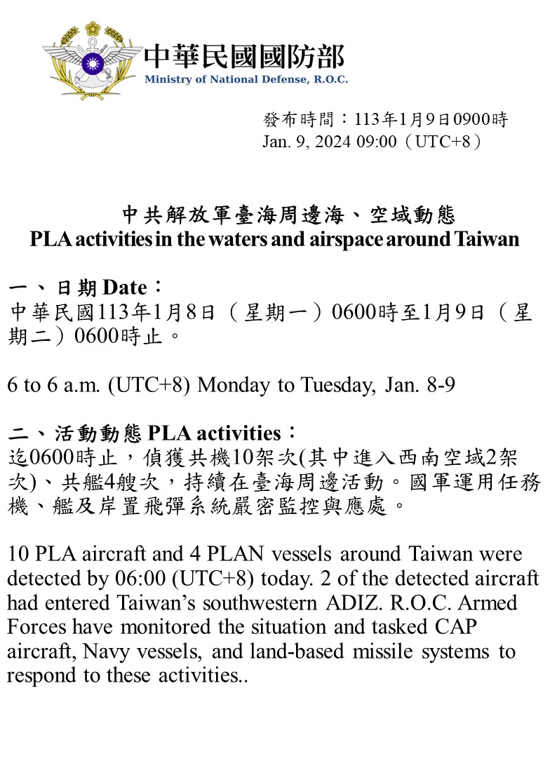 迄0600時止,偵獲共機10架次(其中進入西南空域2架次)、共艦4艘次,持續在臺海周邊活動。國軍運用任務機、艦及岸置飛彈系統嚴密監控與應處。