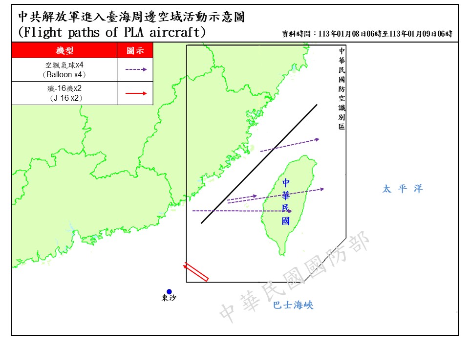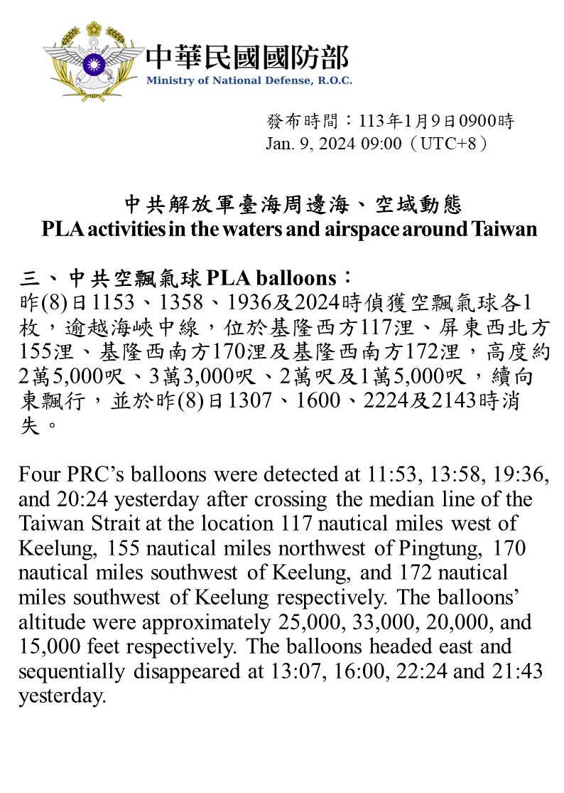 昨(8)日1153、1358、1936及2024時偵獲空飄氣球各1枚,逾越海峽中線,位於基隆西方117浬、屏東西北方155浬、基隆西南方170浬及基隆西南方172浬,高度約2萬5,000呎、3萬3,000呎、2萬呎及1萬5,000呎,續向東飄行,並於昨(8)日1307、1600、2224及2143時消失。