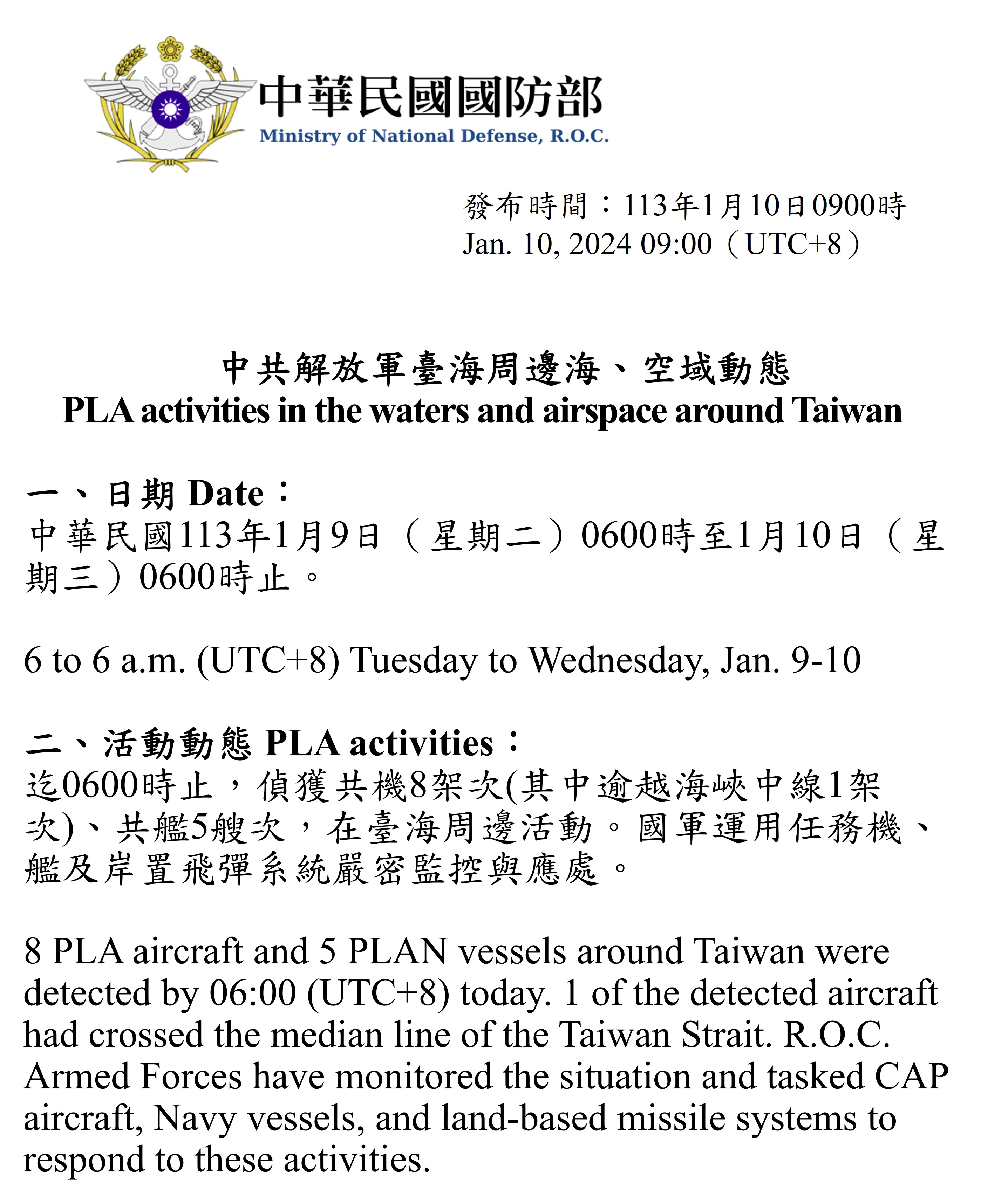 迄0600時止,偵獲共機8架次(其中逾越海峽中線1架次)、共艦5艘次,在臺海周邊活動。國軍運用任務機、艦及岸置飛彈系統嚴密監控與應處。