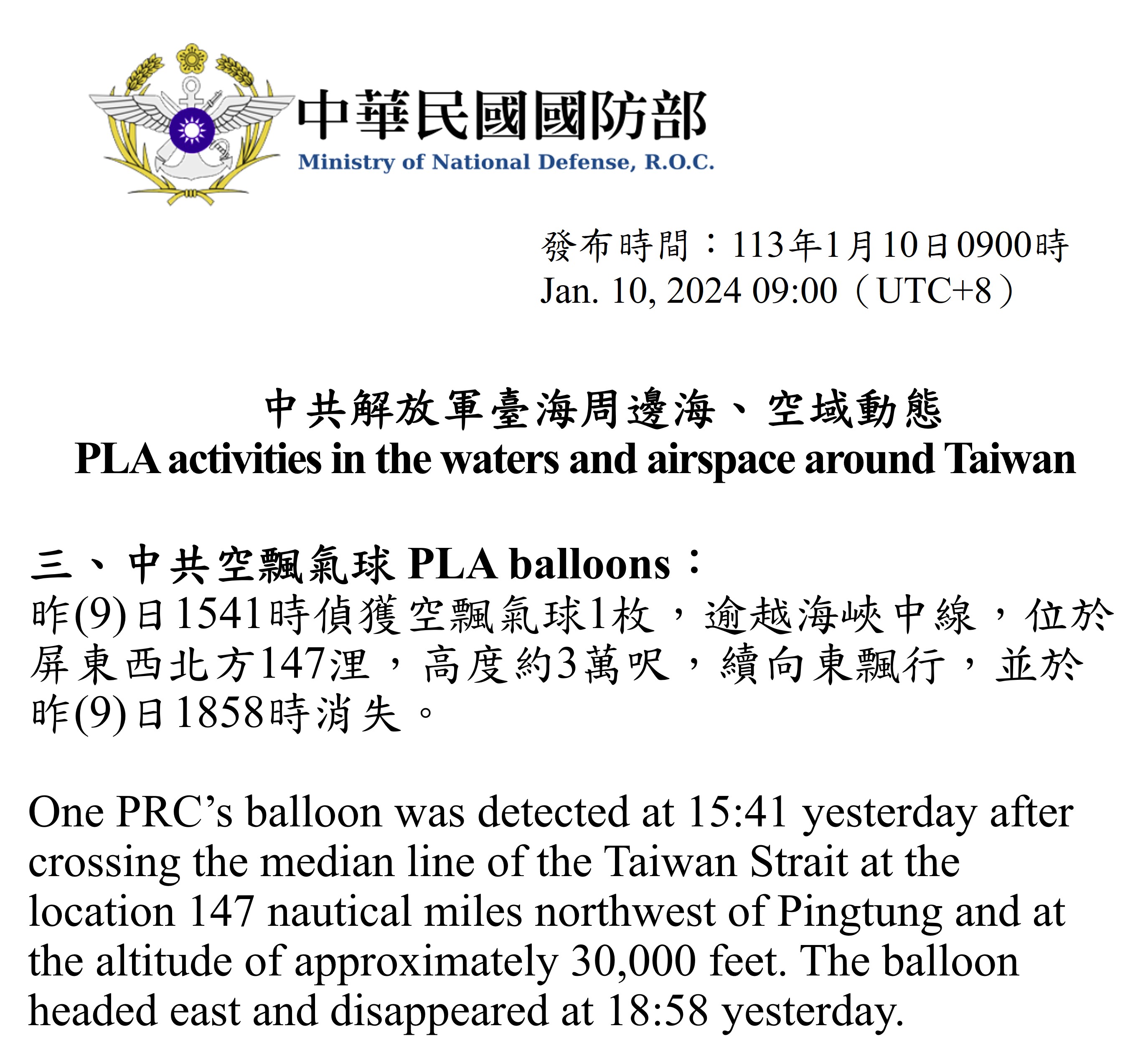 昨(9)日1541時偵獲空飄氣球1枚,逾越海峽中線,位於屏東西北方147浬,高度約3萬呎,續向東飄行,並於昨(9)日1858時消失。