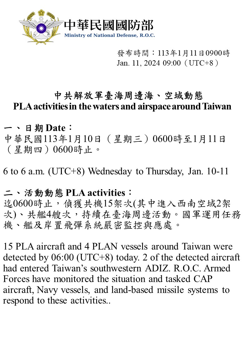 迄0600時止,偵獲共機15架次(其中進入西南空域2架次)、共艦4艘次,持續在臺海周邊活動。國軍運用任務機、艦及岸置飛彈系統嚴密監控與應處。