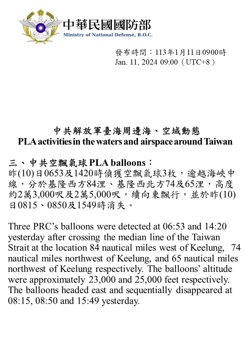 昨(10)日0653及1420時偵獲空飄氣球3枚,逾越海峽中線,分於基隆西方84浬、基隆西北方74及65浬,高度約2萬3,000呎及2萬5,000呎,續向東飄行,並於昨(10)日0815、0850及1549時消失。