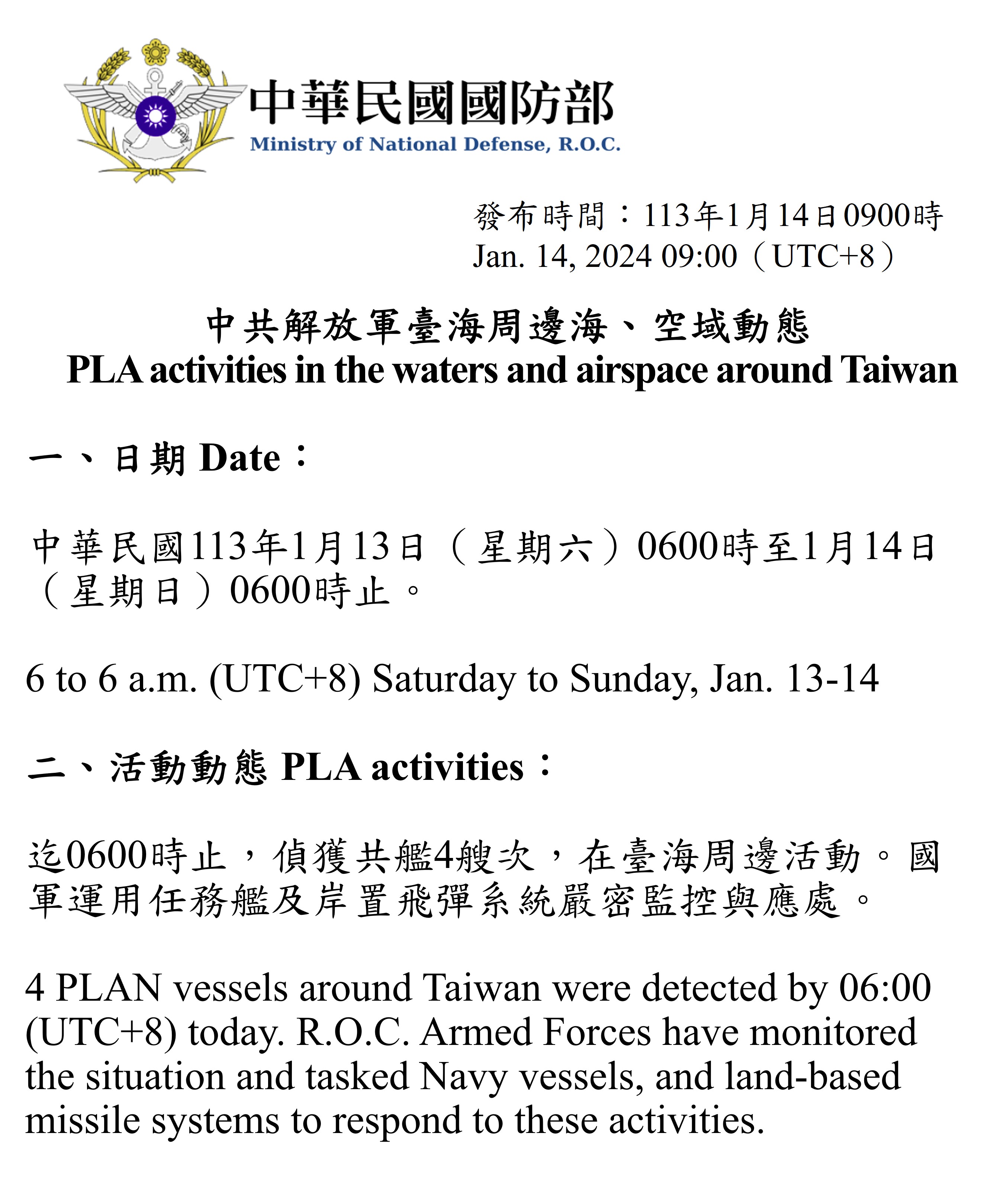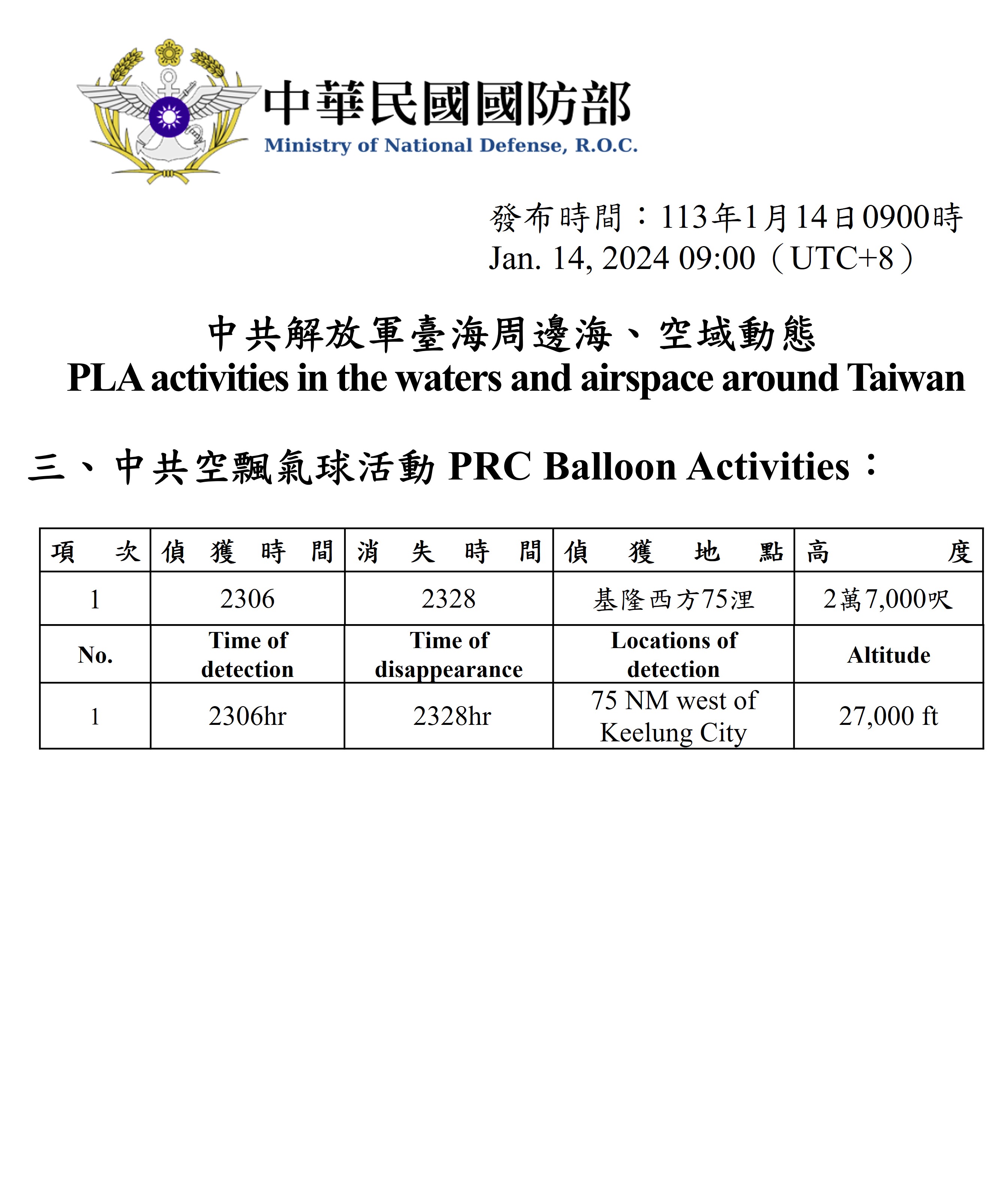中共解放軍臺海周邊海、空域動態(113年1月14日)