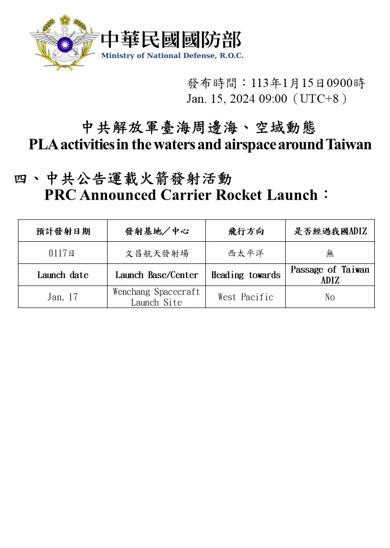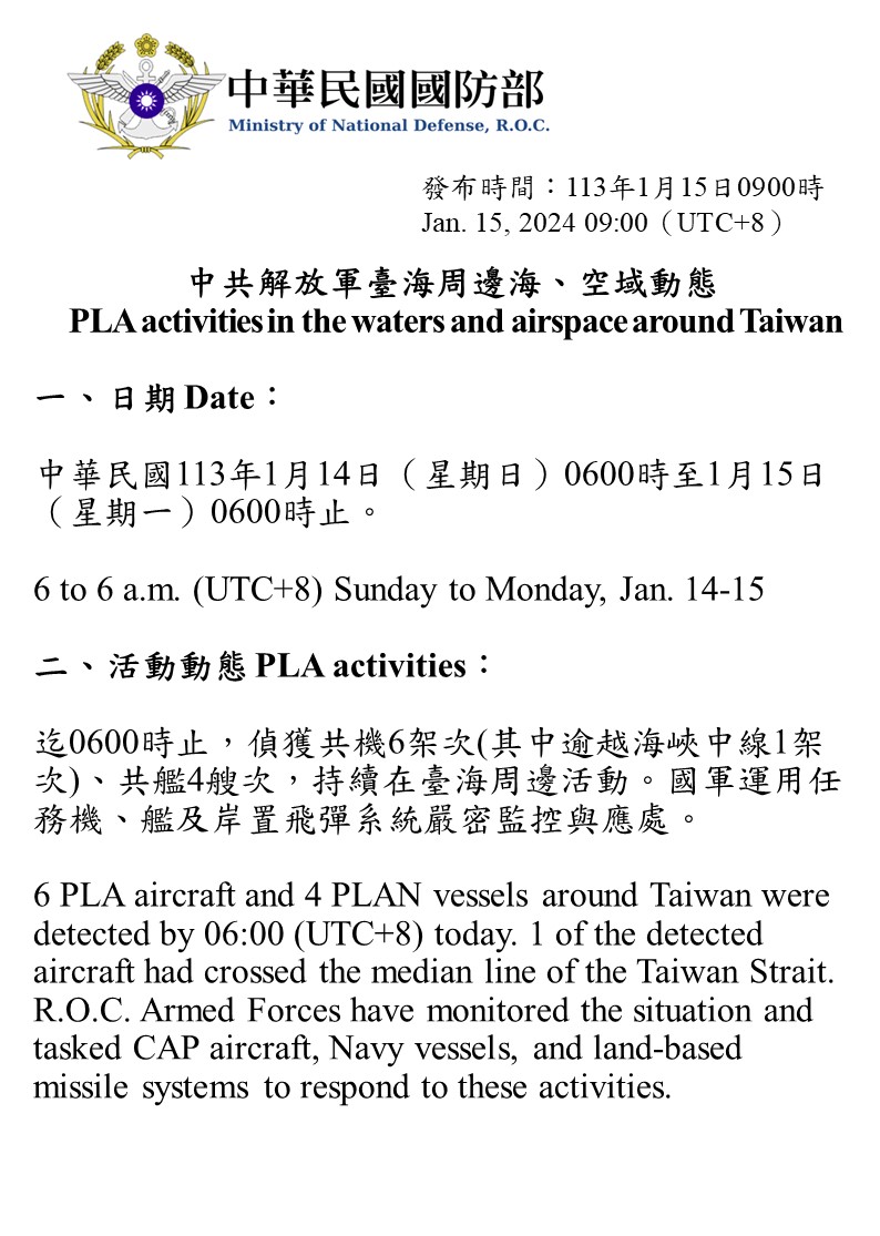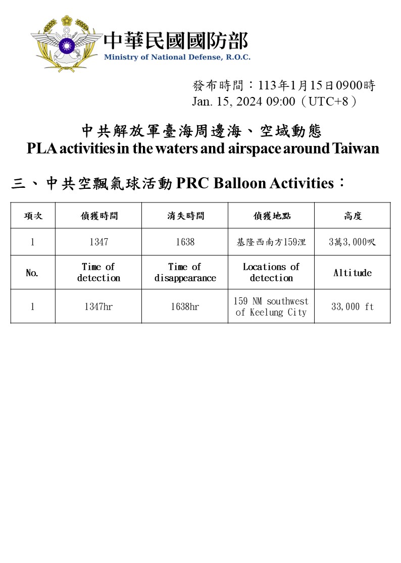 中共解放軍臺海周邊海、空域動態(113年1月15日)