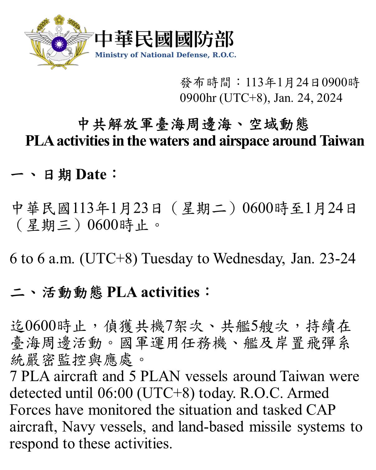 中共解放軍臺海周邊海、空域動態(113年1月24日)