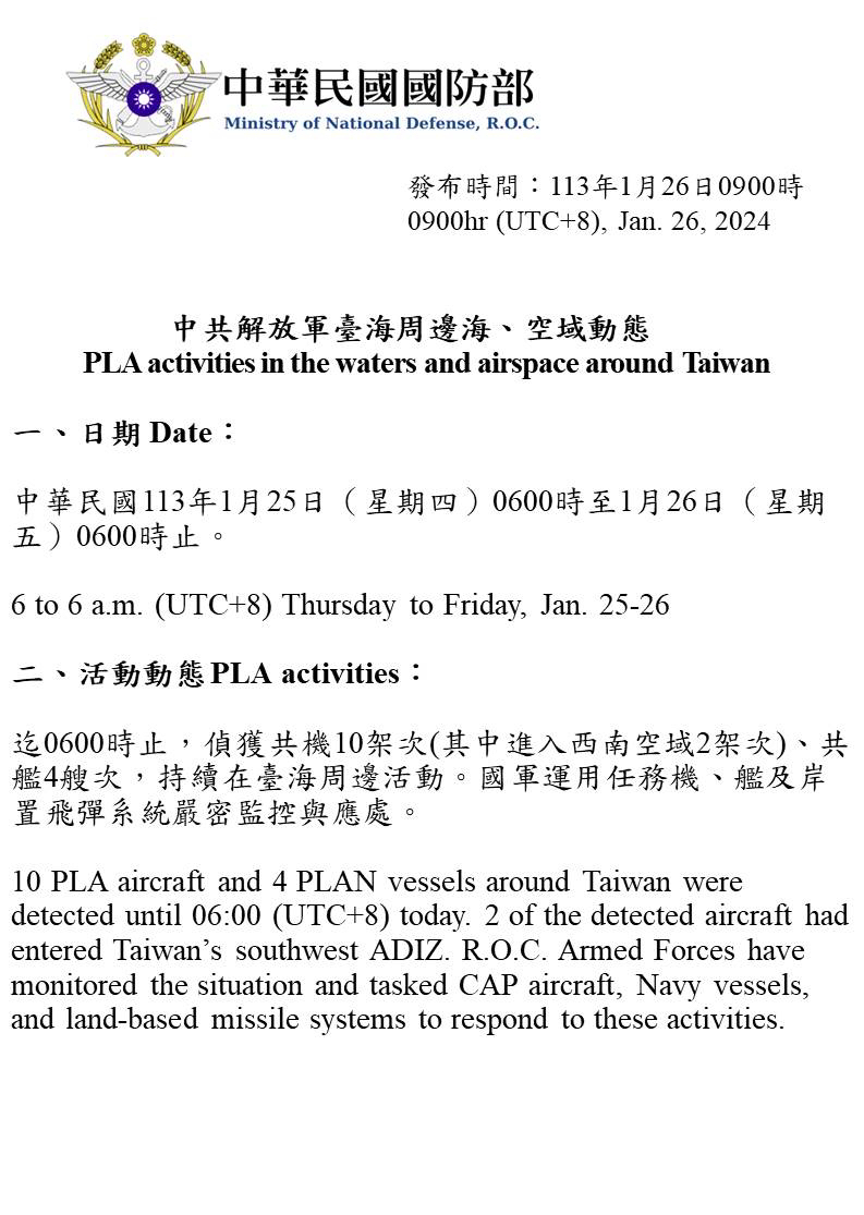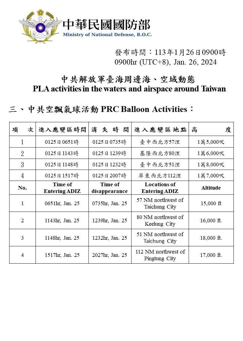 中共解放軍臺海周邊海、空域動態(113年1月26日)