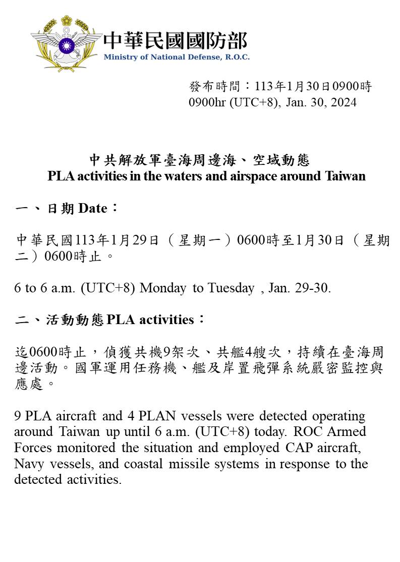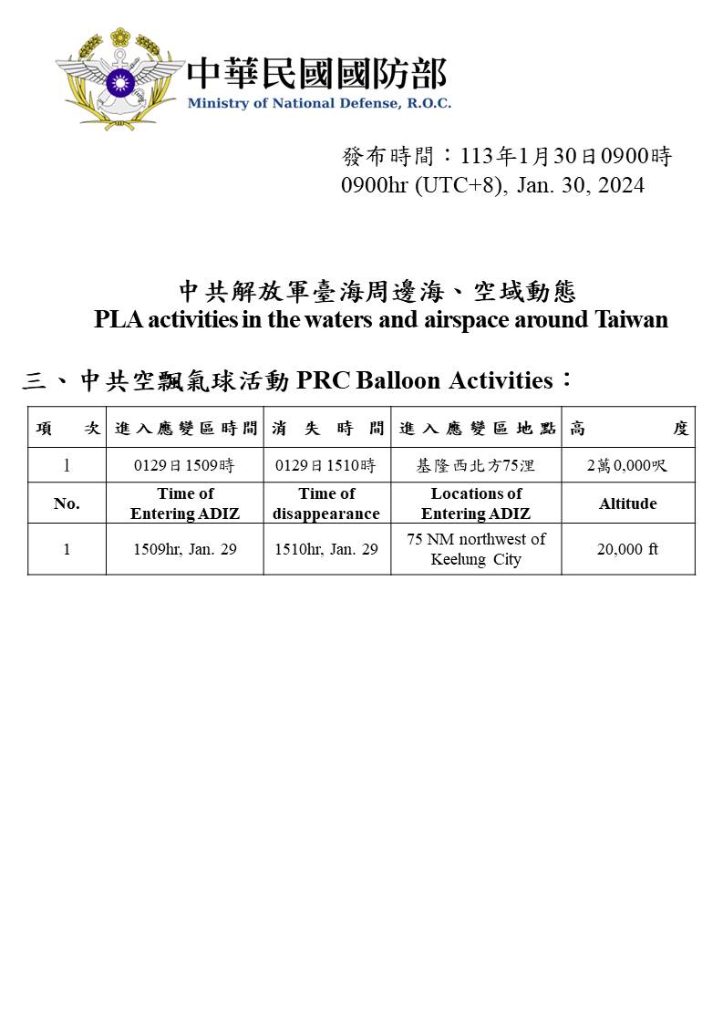 中共解放軍臺海周邊海、空域動態(113年1月30日)