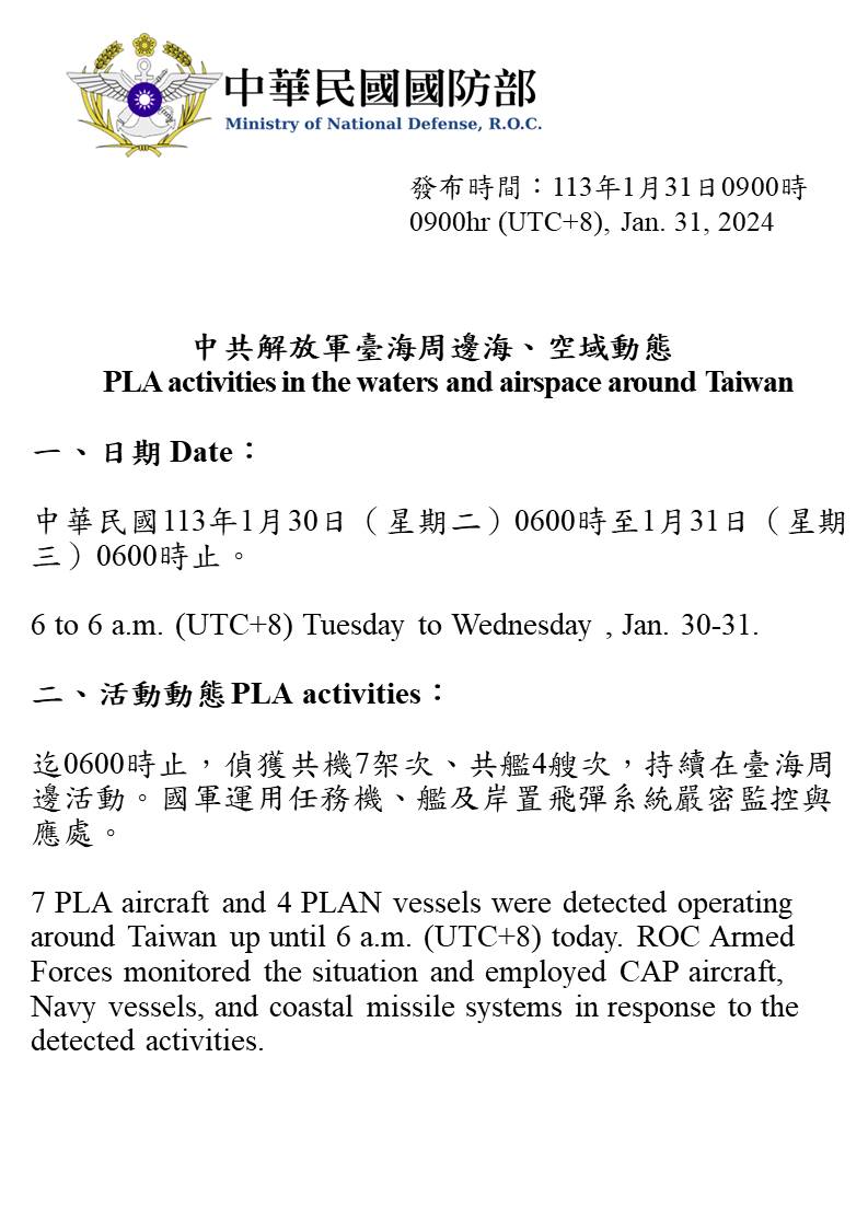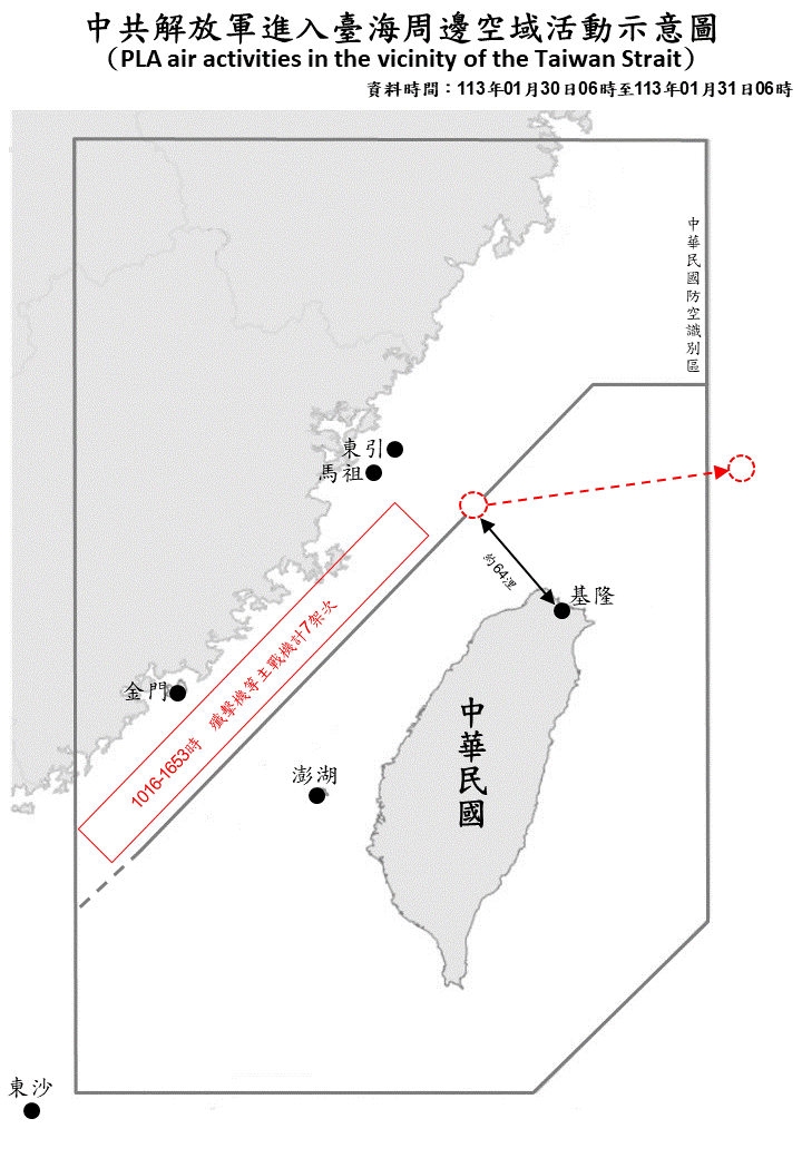 中共解放軍臺海周邊海、空域動態(113年1月31日)