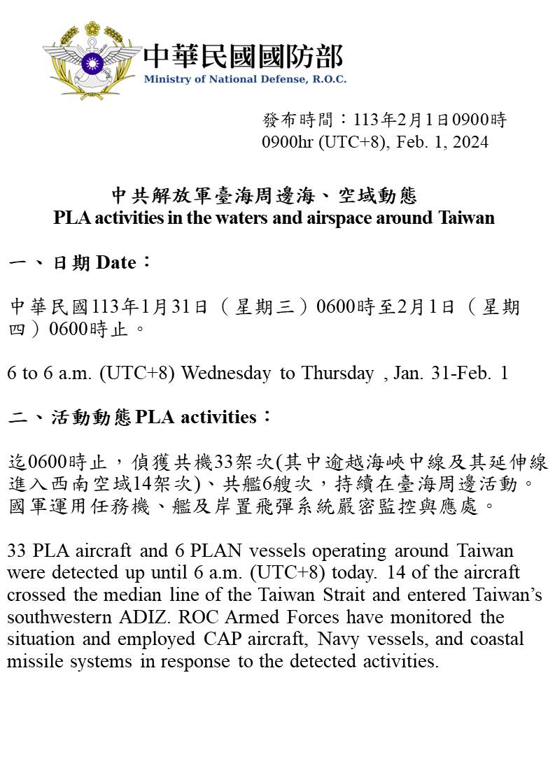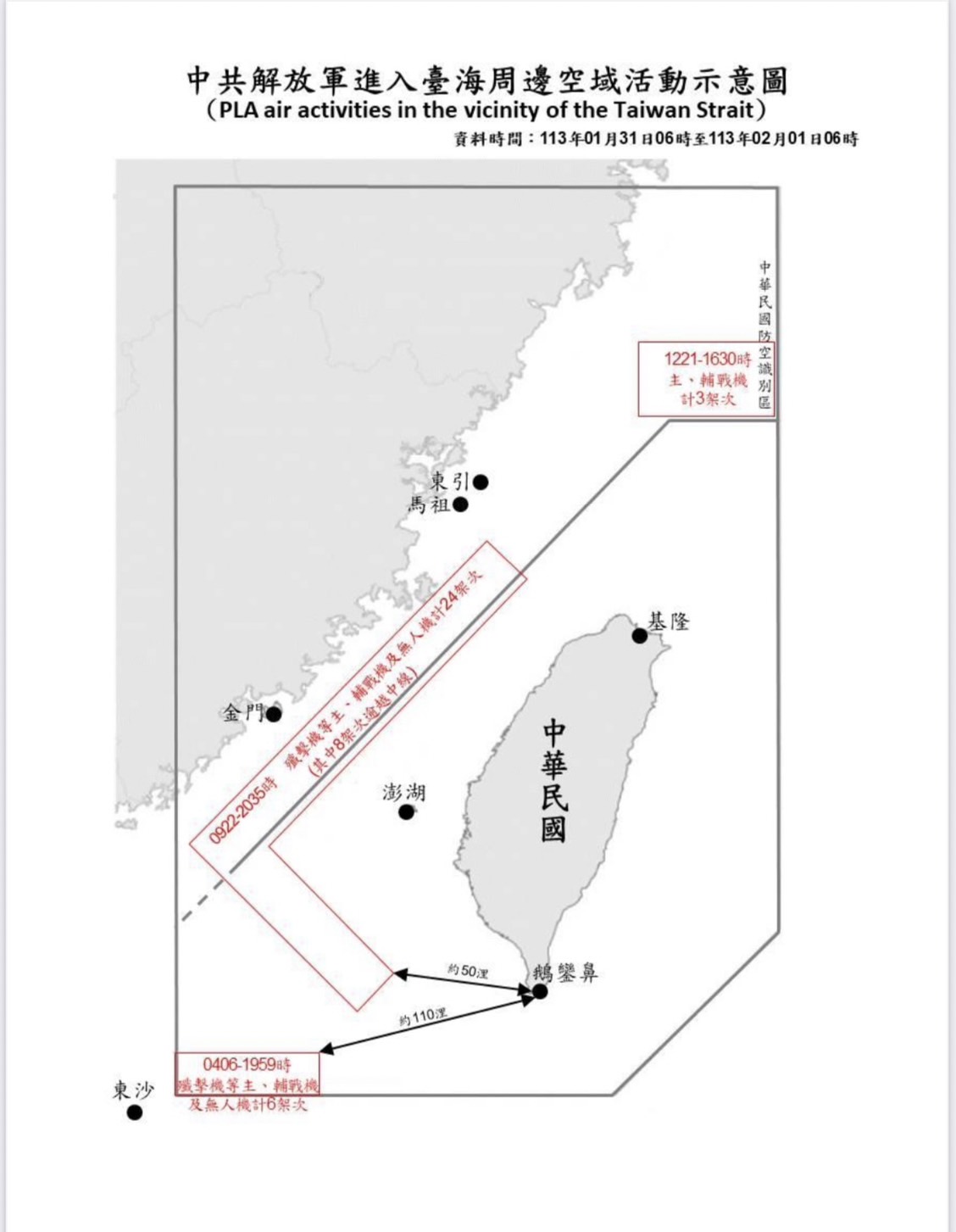 中共解放軍臺海周邊海、空域動態(113年2月1日)