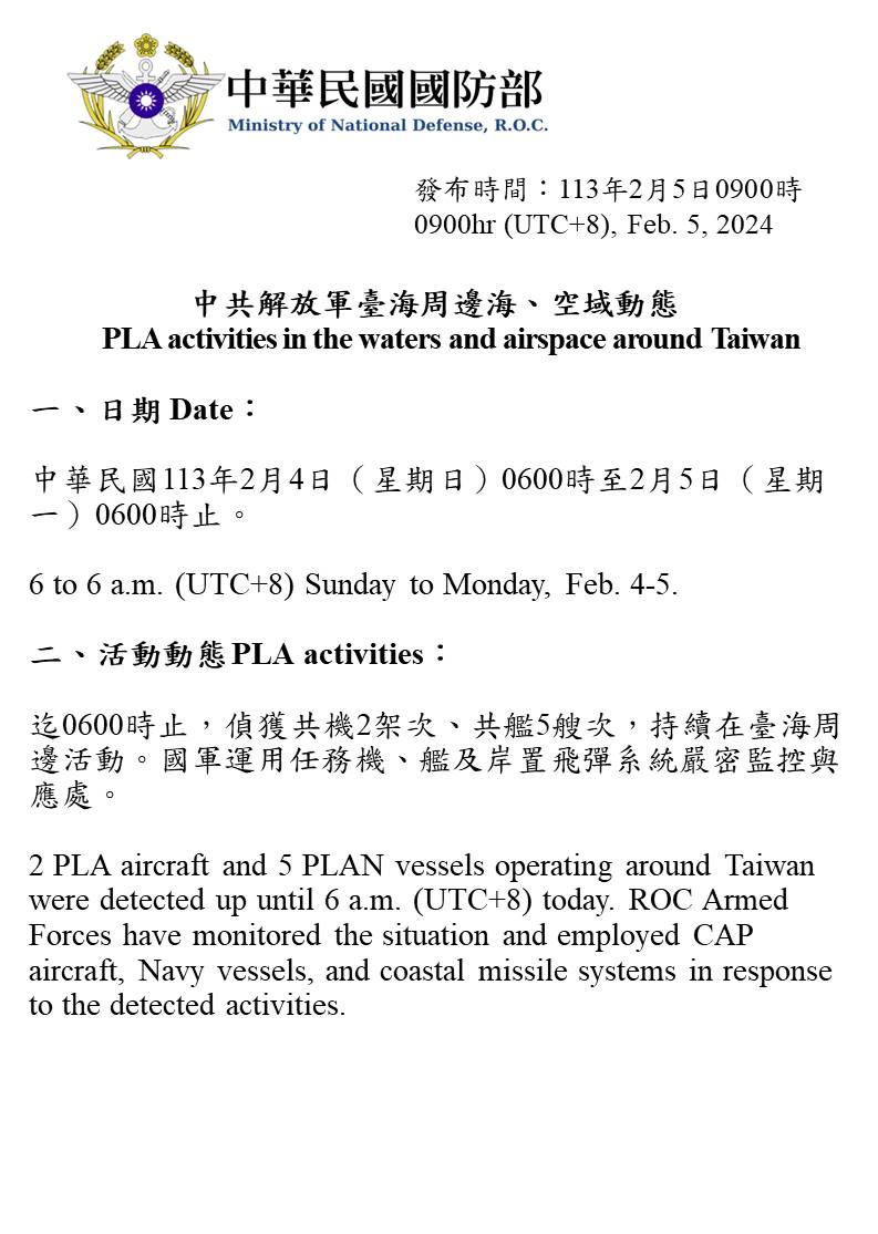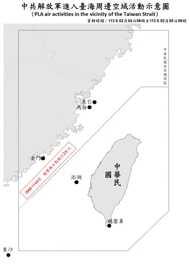 中共解放軍臺海周邊海、空域動態(113年2月5日)