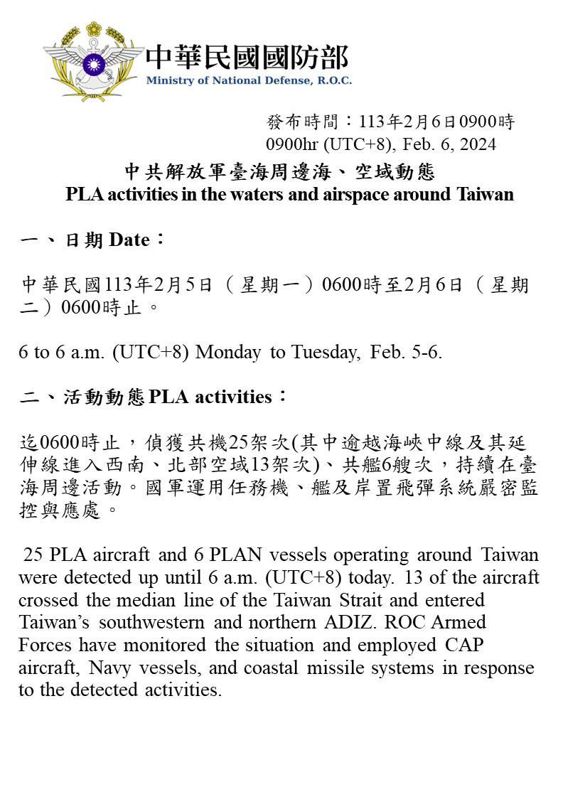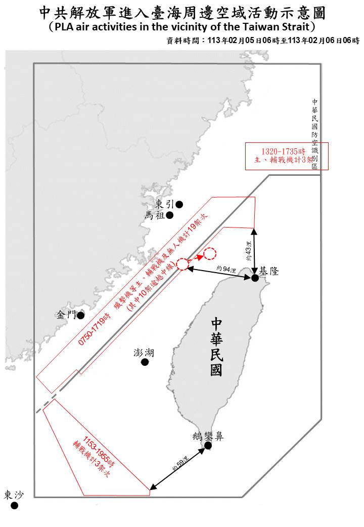 中共解放軍臺海周邊海、空域動態(113年2月6日)