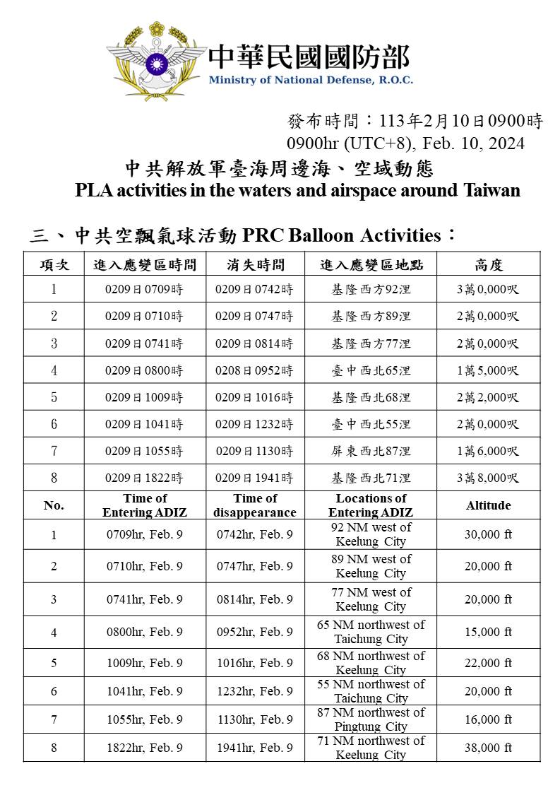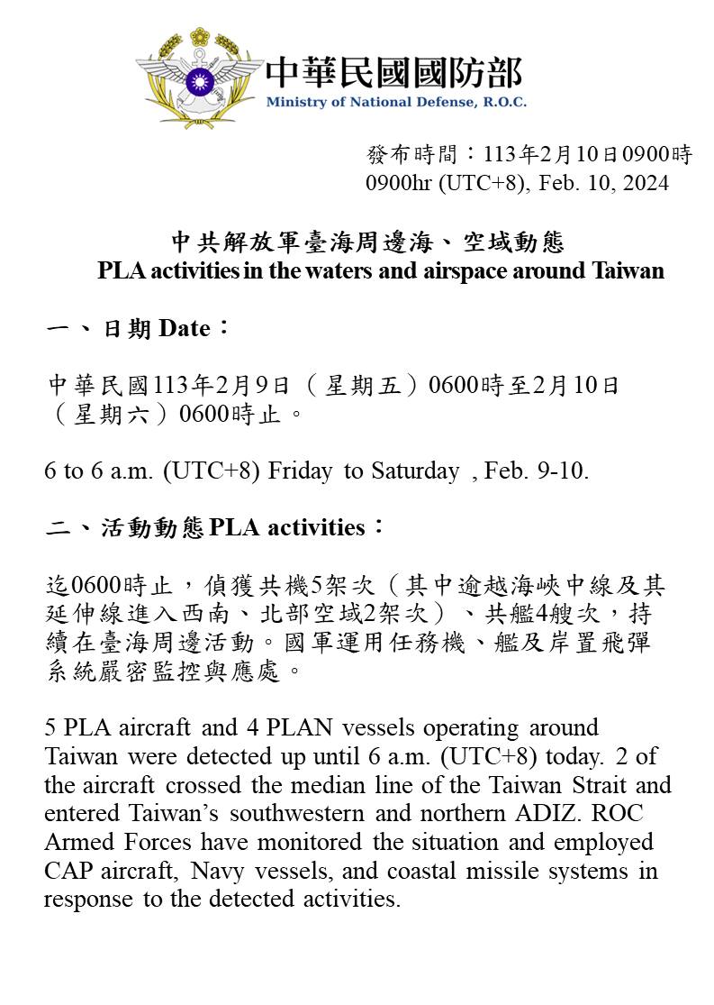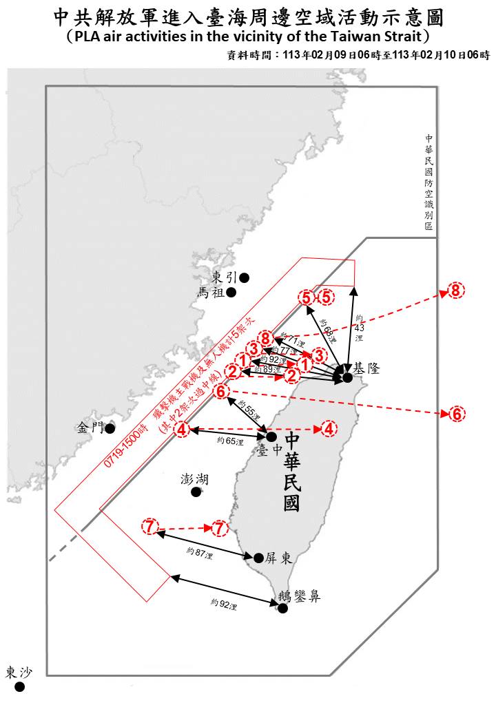 中共解放軍臺海周邊海、空域動態(113年2月10日)