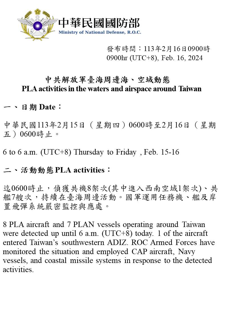 中共解放軍臺海周邊海、空域動態(113年2月16日)