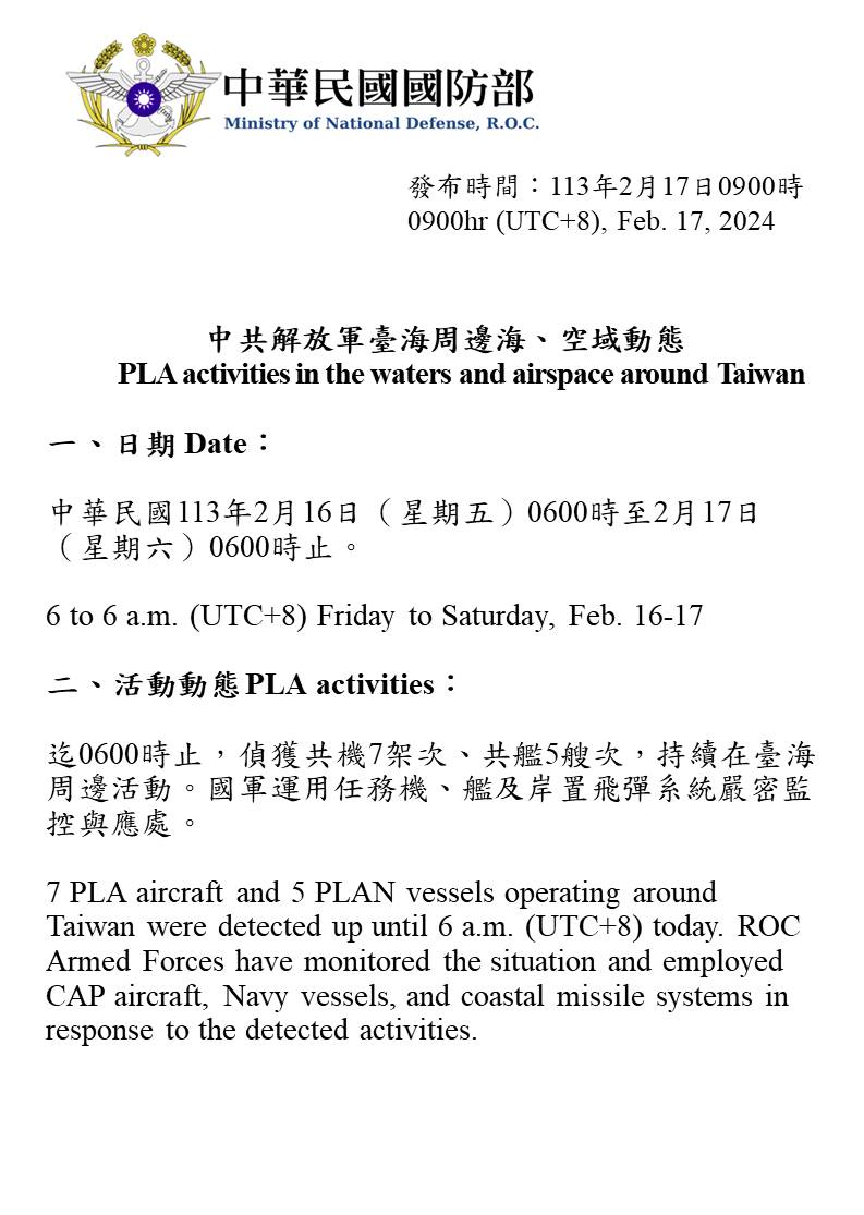 中共解放軍臺海周邊海、空域動態(113年2月17日)