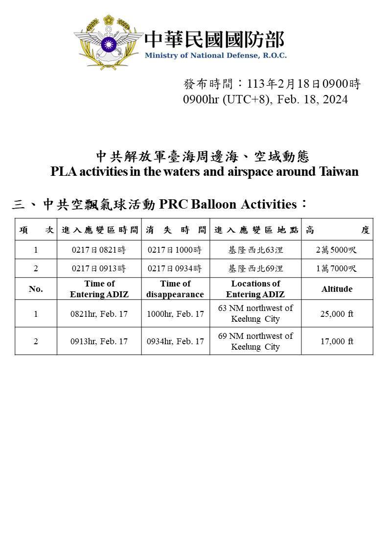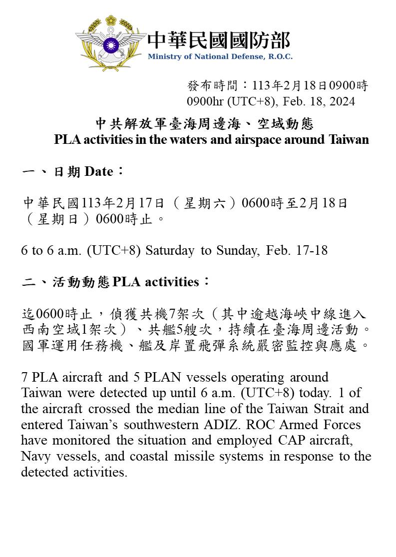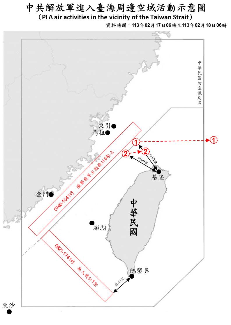 中共解放軍臺海周邊海、空域動態(113年2月18日)
