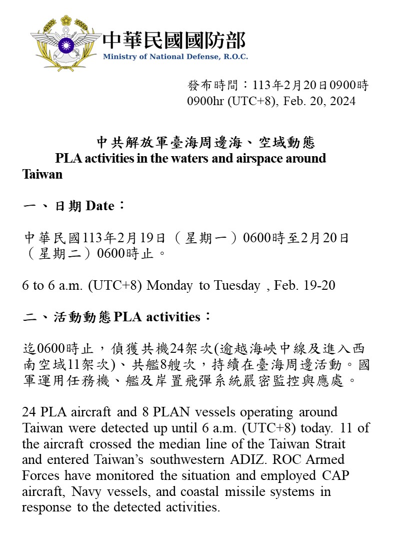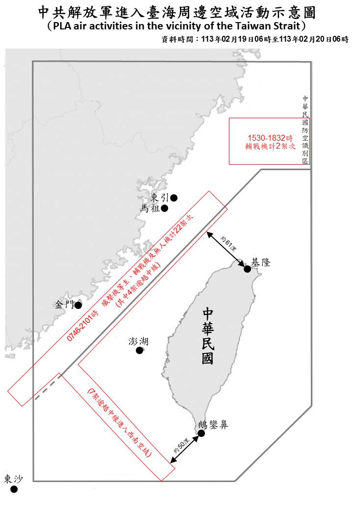 中共解放軍臺海周邊海、空域動態(113年2月20日)