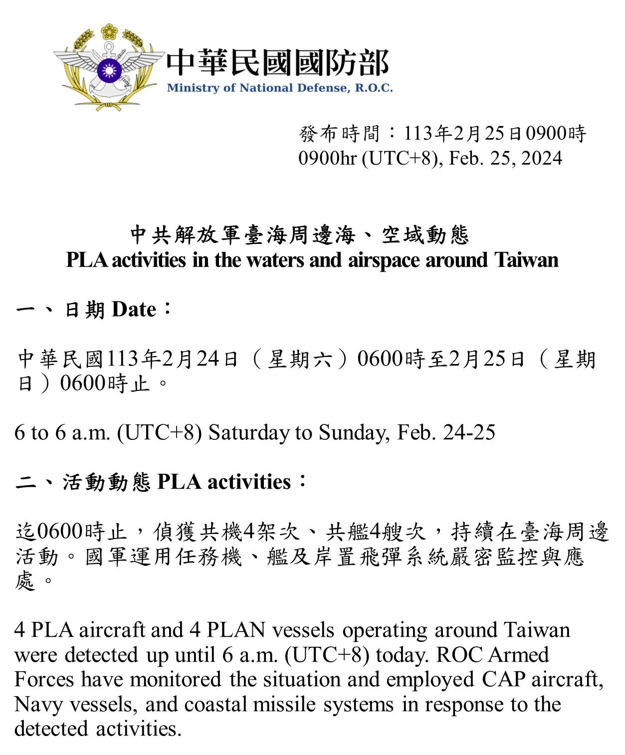 中共解放軍臺海周邊海、空域動態(113年2月25日)