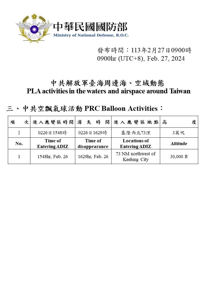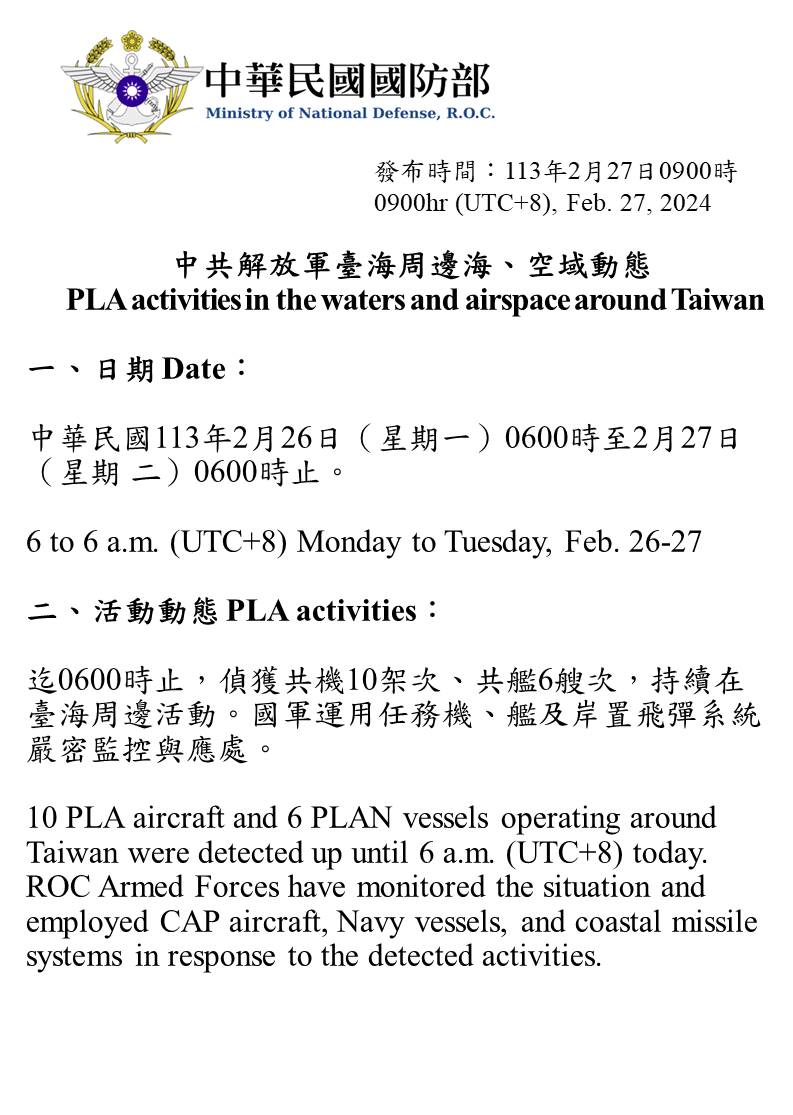 中共解放軍臺海周邊海、空域動態(113年2月27日)