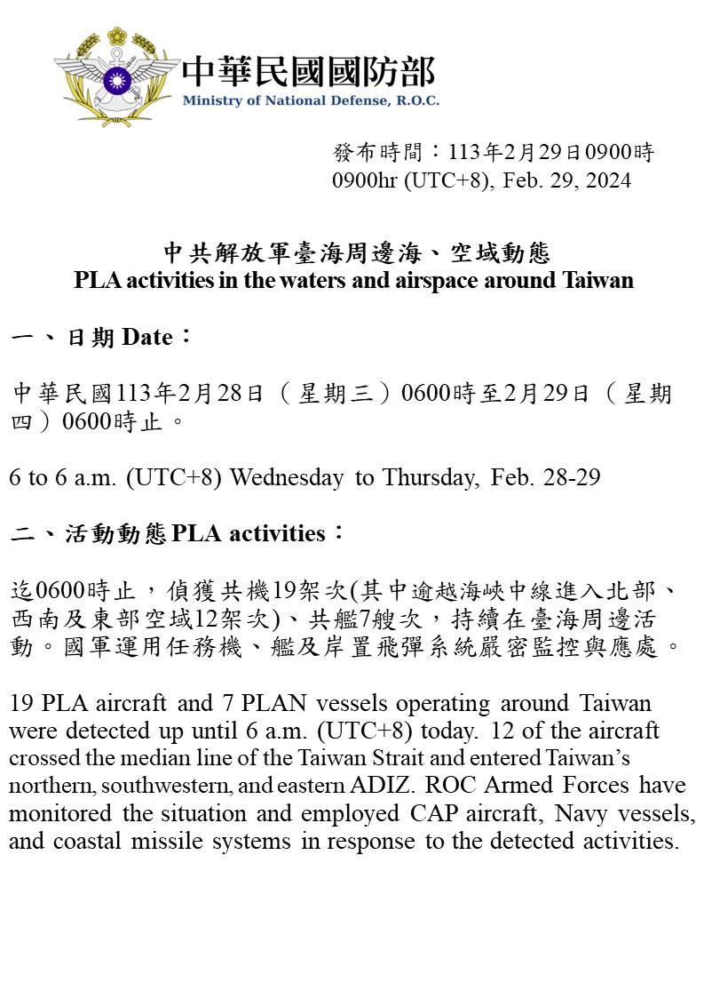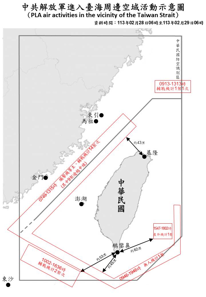 中共解放軍臺海周邊海、空域動態(113年2月29日)
